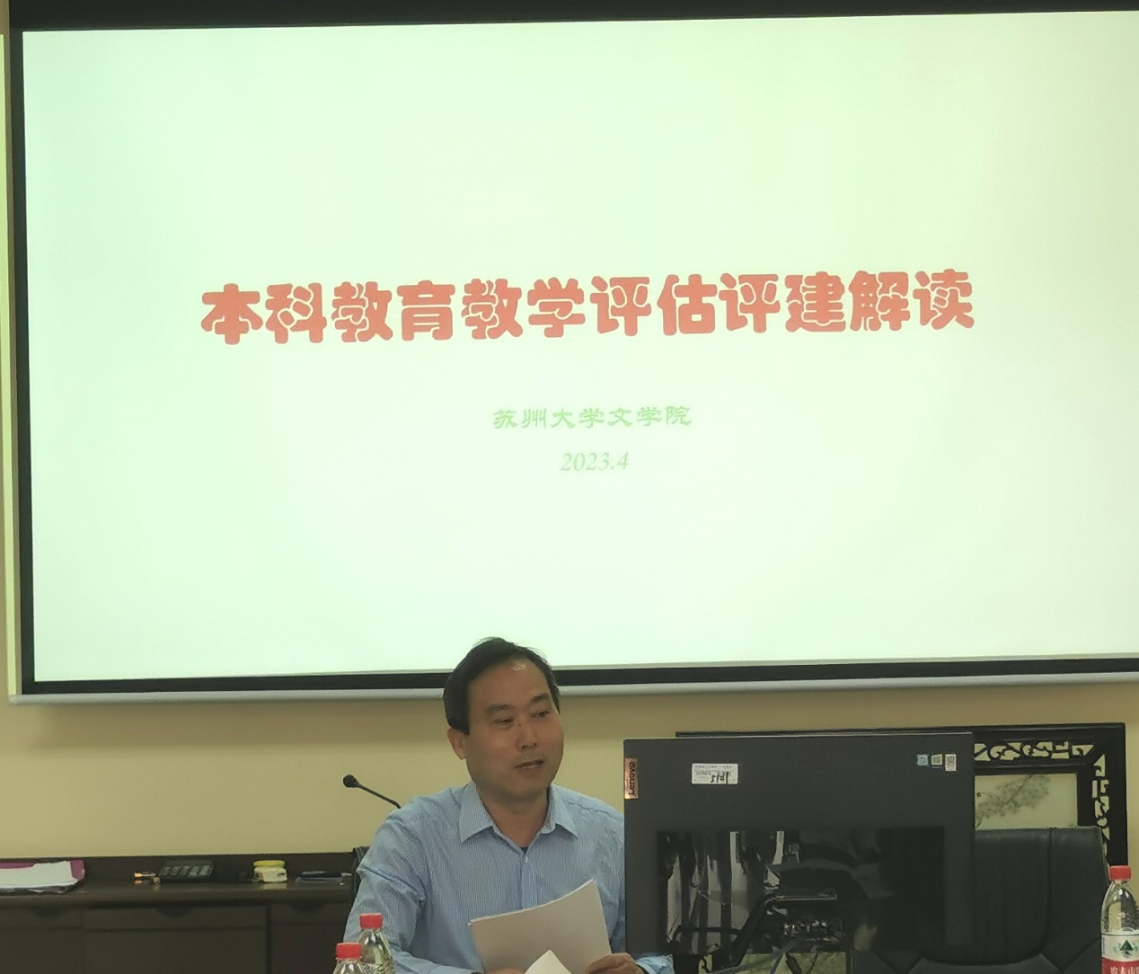 周生杰副院长介绍了本次教育教学评估工作的基本要求,包括:导向和内涵两方面的主要变化,资源条件、教学管理制度、质量保障能力和体系等三个评估重点,线上评估、分类评估、优化流程、多元评价等四方面创新方法。他从教师们所面对的本科教学实际问题入手,提出了以下优化建议:一是每门课必须有教学大纲,并据此制定教学目标和教学计划;二是选用高质量的精品教材;三是采用多种教学方式,提高学生参与课堂的积极性;四是做好课程考核试卷的批阅和存档工作,注重过程化考核;五是做好毕业论文的指导和评价工作。另外,还向老师们明确了教学工作的时间节点,详细布置了各阶段的任务安排。