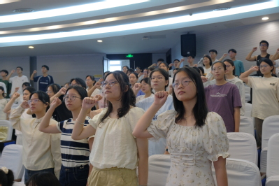 2024级全体本科生在符思迪同学的带领下,高举右拳作出庄严宣誓,传递出要努力成为“德智体美劳全面发展的社会主义建设者和接班人”的决心。