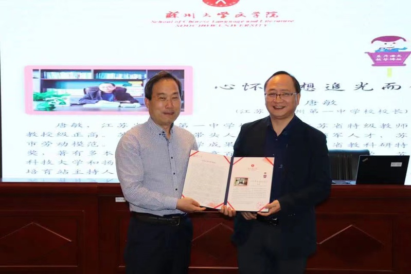 首先,纪金平老师对唐校长的到来表示热烈欢迎,并对唐校长进行了介绍,随后,周生杰副院长向唐敏校长颁发荣誉证书。