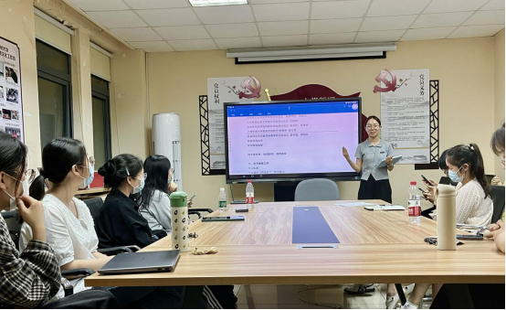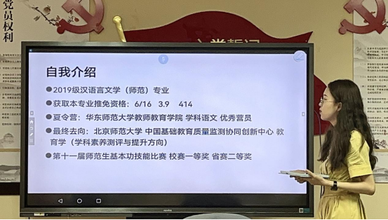 在领学完毕后,紧接着三位党员同志围绕夏令营、师范生基本功比赛、师范生技能大赛及支教保研相关政策解读等方面为大家进行了详细的介绍。