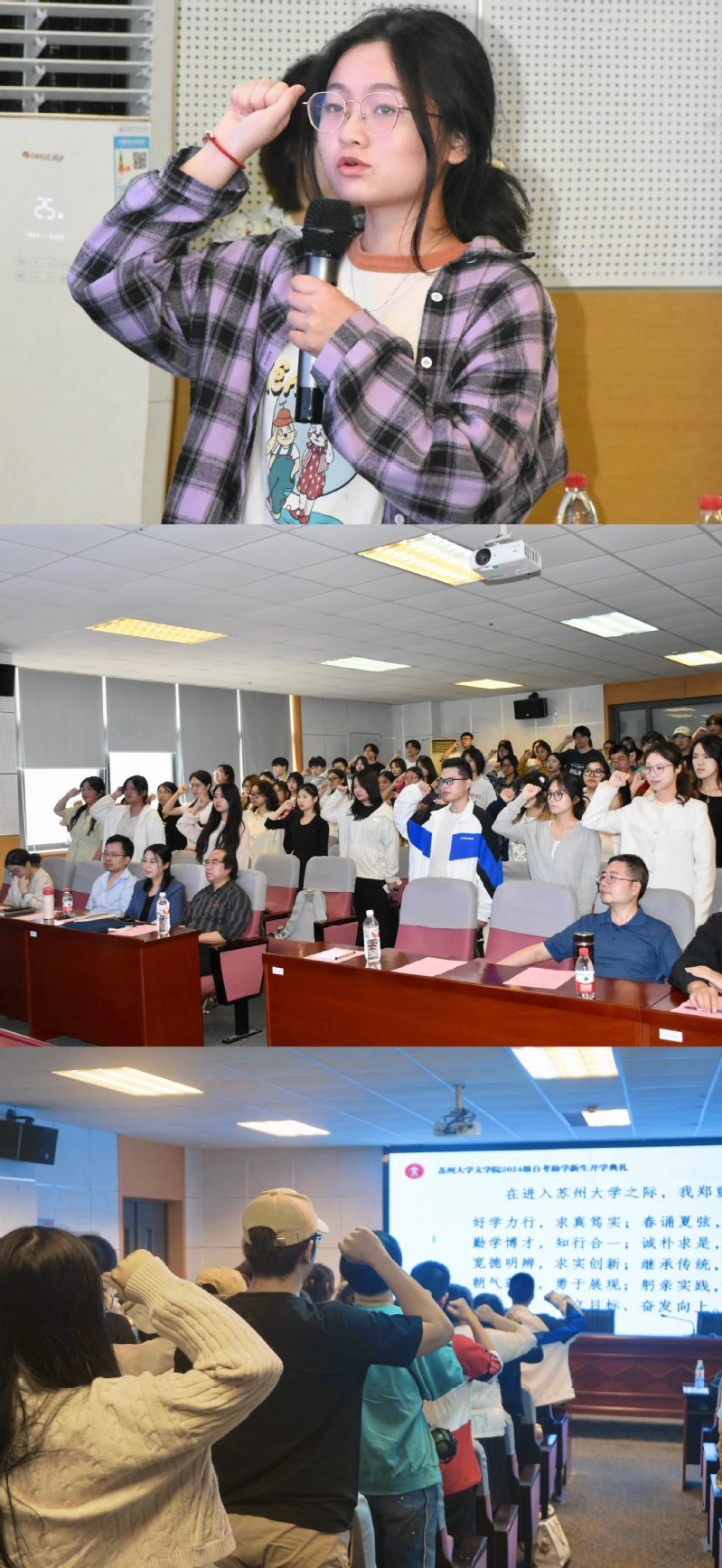 接下来,2024级汉语言文学专业新生代表查牧雪同学带领2024级全体新生进行了慷慨激昂的入学宣誓。