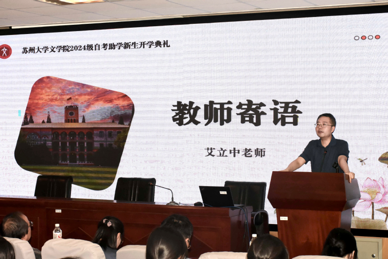 教师代表艾立中老师以自身的教学经验为例向新生们传授了学习方法,鼓励大家保持好奇心和求知欲。