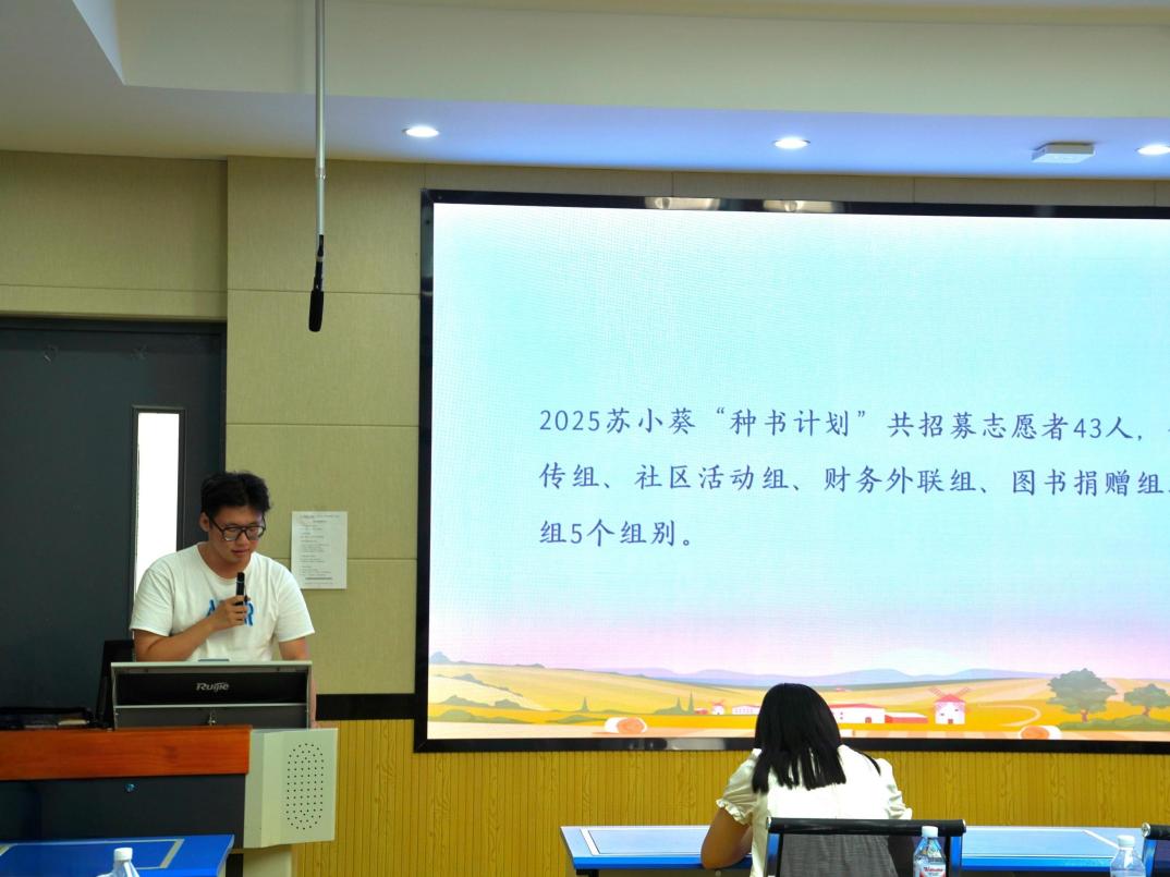 在出征仪式上,苏小葵“种书计划”负责人姚天瑞同学系统介绍了宣传组、社区活动组、财务外联组、图书捐赠组以及支教组五个工作组的具体职责。