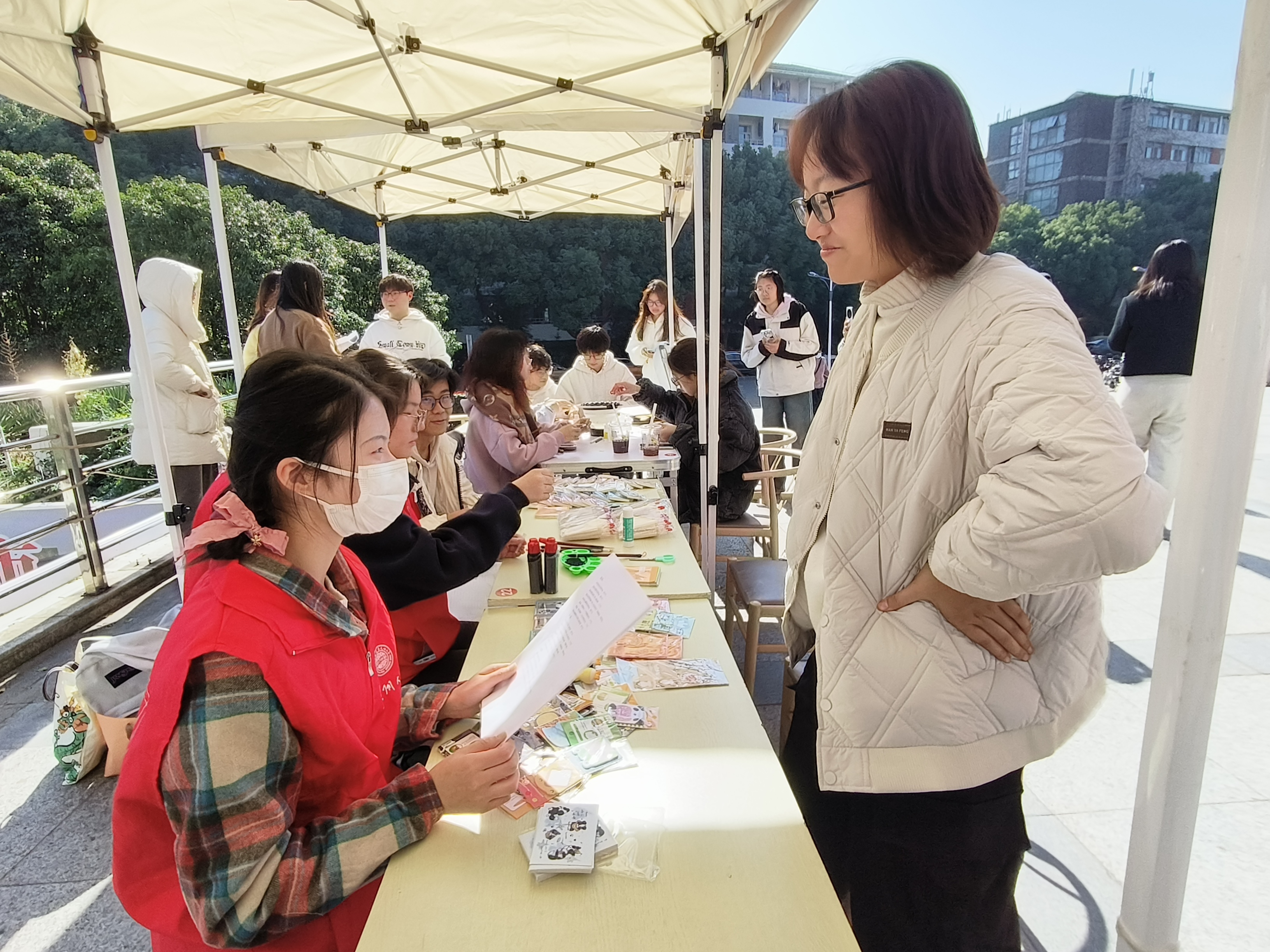 活动伊始,工作人员宣讲楼凤网 特色志愿服务活动,推广三大品牌项目;布置好“惠寒”横幅、“青盾计划”海报、传统文化公益课堂活动照片墙、钥匙扣、杯垫等文创,以活跃志愿集市氛围、吸引现场同学。
