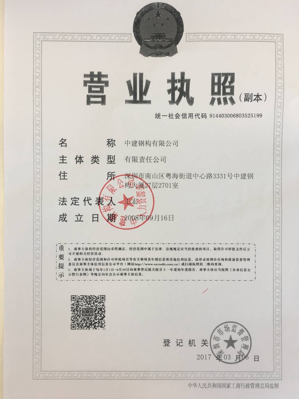 中建钢构有限公司是中国最大的钢结构产业集团、国家高新技术企业、深圳市总部经济企业、世界500强第24位――中国建筑工程总公司二级单位。公司聚焦以钢结构为主体结构的工程业务,致力于为客户提供“投资+研发+设计+建造+运营”一体化的解决方案,具有建筑工程施工总承包特级、钢结构工程专业承包壹级、建筑行业工程设计甲级等资质。中建钢构总部大厦位于深圳市南山区后海中心,毗邻阿里巴巴、华润等世界知名企业。