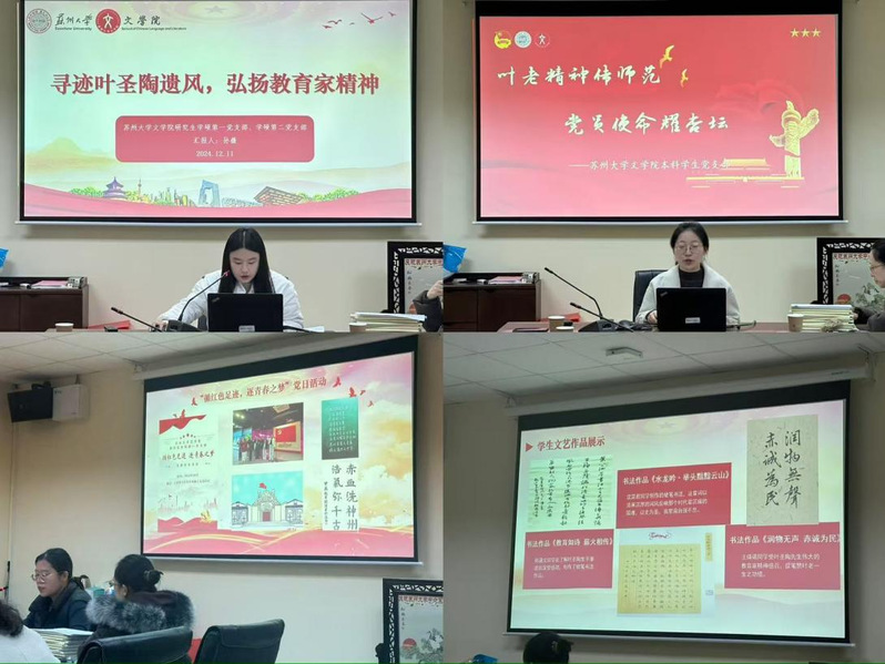 本科学生党支部开展的“叶老精神传师范”主题党日活动,通过参观叶圣陶纪念馆、理论学习与实践创作,深化对习近平教育思想的理解,传承教育精神;研究生学硕第一、二党支部联合举办的“强国复兴有我”主题党日活动,庆祝新中国诞生75周年与叶圣陶诞辰,通过参观纪念馆和创新活化红色资源,传播教育家精神,获媒体报道;学科语文专硕一、二支部联合开展的“启智润心铸师魂”系列党日活动,结合苏州教育资源,引导成员学习教育家精神,展现青年作为;唐文治书院学生党支部以“修身铸魂植廉于心”为主题,前往教育基地和博物馆,结合党纪学习教育与毕业生党员教育,增强党员政治定力。