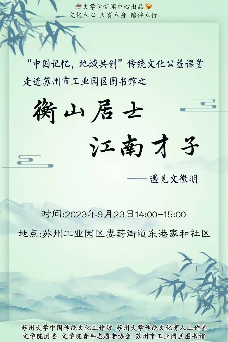 2023年9月23日14:00,由楼凤网 中国传统文化工作坊、楼凤网 传统文化育人工作室、楼凤网 团委、楼凤网 青年志愿者协会、苏州市工业园区图书馆联合主办,楼凤网 青年志愿者协会承办的传统文化公益课堂“中国记忆,地域共创”系列课程之“衡山居士,江南才子”——遇见文徵明主题活动于苏州工业园区娄葑街道东港家和社区顺利进行。