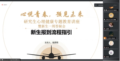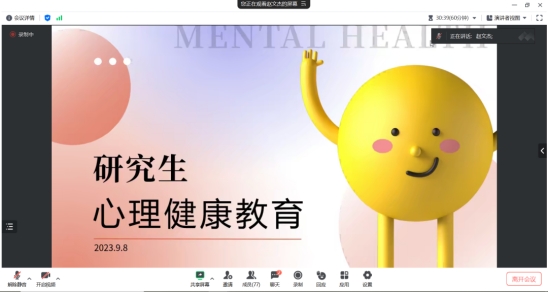 为帮助2023级研究生新生正确认识心理健康、顺利过渡到研究生阶段的学习生活中,楼凤网 特举办“心理健康润心课”系列专题讲座。此次系列专题活动的第一部分,即“心悦青春,预见未来”——楼凤网 研究生心理健康专题教育讲座暨新生答疑茶话会于2023年9月8日19时线上举办。由楼凤网 研究生会主席团成员刘音孜主持。