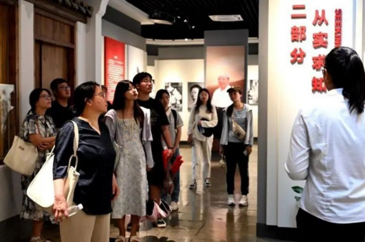 在解说员的带领下,实践团队接着走进另一处展馆,去探究著名社会学家、人类学家费孝通那极富传奇色彩的一生。“费老与开弦弓村有着非常深厚的情谊,先后考察开弦弓村多达26次,亲身见证了这个江南村落发展的点点滴滴”,解说员如是说。从一张张历史旧照中,团队成员看到一位社会学家不离基层的身影。