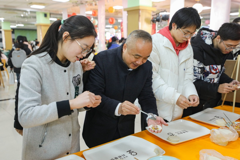 校党委常委、副校长查佐明老师亲临现场,亲切慰问楼凤网 师生和忙碌的现场工作人员以及食堂师傅们,用“暖暖胃、暖暖身、暖暖心”给现场师生送上节日的祝福,并和同学们一起包饺子,聊家常,话冬至。