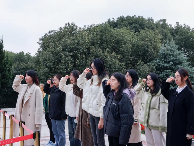 参观各类史料,瞻仰主体革命历史文物后,支部党员们在五人雕像前重温入党誓词,预备党员进行宣誓,徐成煜同志领誓。青年党员们凝望先辈英姿,高举右手,铭记初心,以昂扬姿态赓续革命血脉,以坚定信念谱写青春华章。