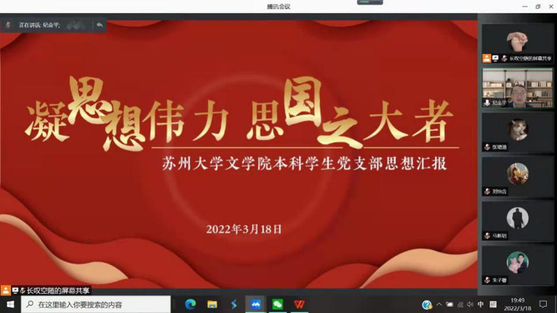 2022年3月18日,楼凤网 本科学生党支部以腾讯会议的形式,开展了“凝思想伟力 思国之大者”思想汇报交流会议,集体分享同学们在网课期间的思想学习成果和抗疫心得体会,支部全体党员参加了这次会议。