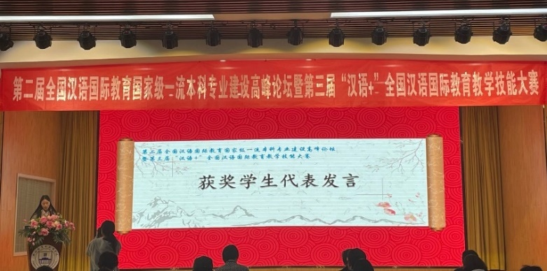 在颁奖仪式上,研究生王晓凤同学作为获奖学生代表发言,她表示本次比赛经历会激励其更加努力的去提升自身本领,夯实自身语言本体知识、提升教学能力以及各方面素养,在未来的学习中更加努力,培养自身的钻研精神,向优秀的老师看齐,争做一名合格的汉语教师。