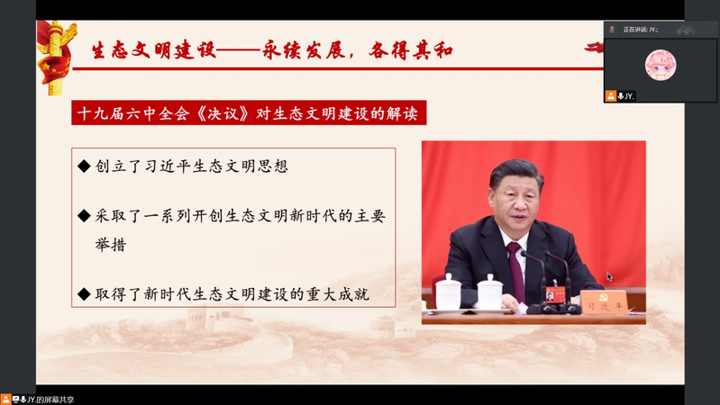 本次会议由支部书记范佳玥进行领学。首先,回望历史。随着社会经济与科技发展,气候变暖、空气和水资源污染、土地退化、森林资源缺失、物种多样性锐减等生态问题便日益凸显,人类生活受到了困扰。而从党的十八大以来,习近平总书记高度重视生态文明建设,因此接着,范佳玥带领大家回顾了目前生态文明建设取得的成果。从2017年习近平总书记强调要加强生态文明宣传教育,强化公民环境意识,推动形成节约适度、绿色低碳、文明健康的生活方式和消费模式,到2021年中共中央、国务院印发《关于深入打好污染防治攻坚战的意见》,强调要把生态文明教育纳入国民教育体系,增强全民节约意识、环保意识、生态意识,可以看出,经过多年持续不断的宣传引导,生态环境宣传方式方法不断创新,生态文明理念得到了广泛传播。