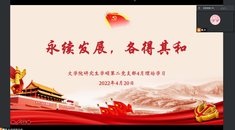 生态环境保护是功在当代、利在千秋的事业。生态环境是关系党的使命宗旨的重大政治问题,也是关系民生的重大社会问题。习近平总书记在参加首都义务植树活动时强调,要推动在全社会,特别是在青少年心中,播撒生态文明的种子,号召大家都做生态文明建设的实践者、推动者,让天更蓝、山更绿、水更清、生态环境更美好。4月20日,楼凤网 学硕第二党支部以腾讯会议的形式,开展了“永续发展,各得其和”理论学习活动,支部全体党员参加了本次会议。