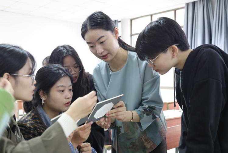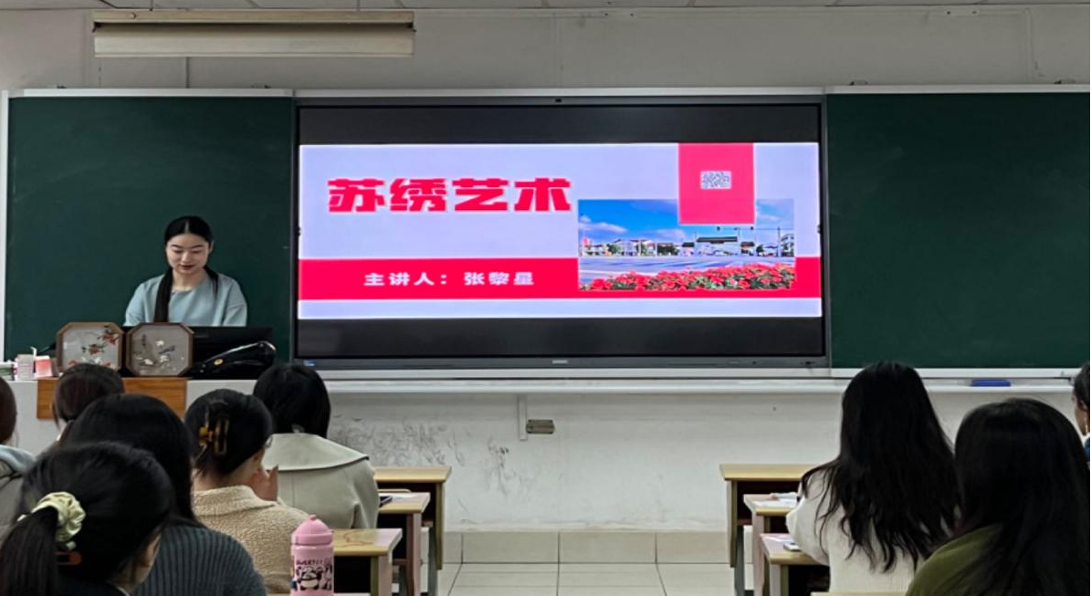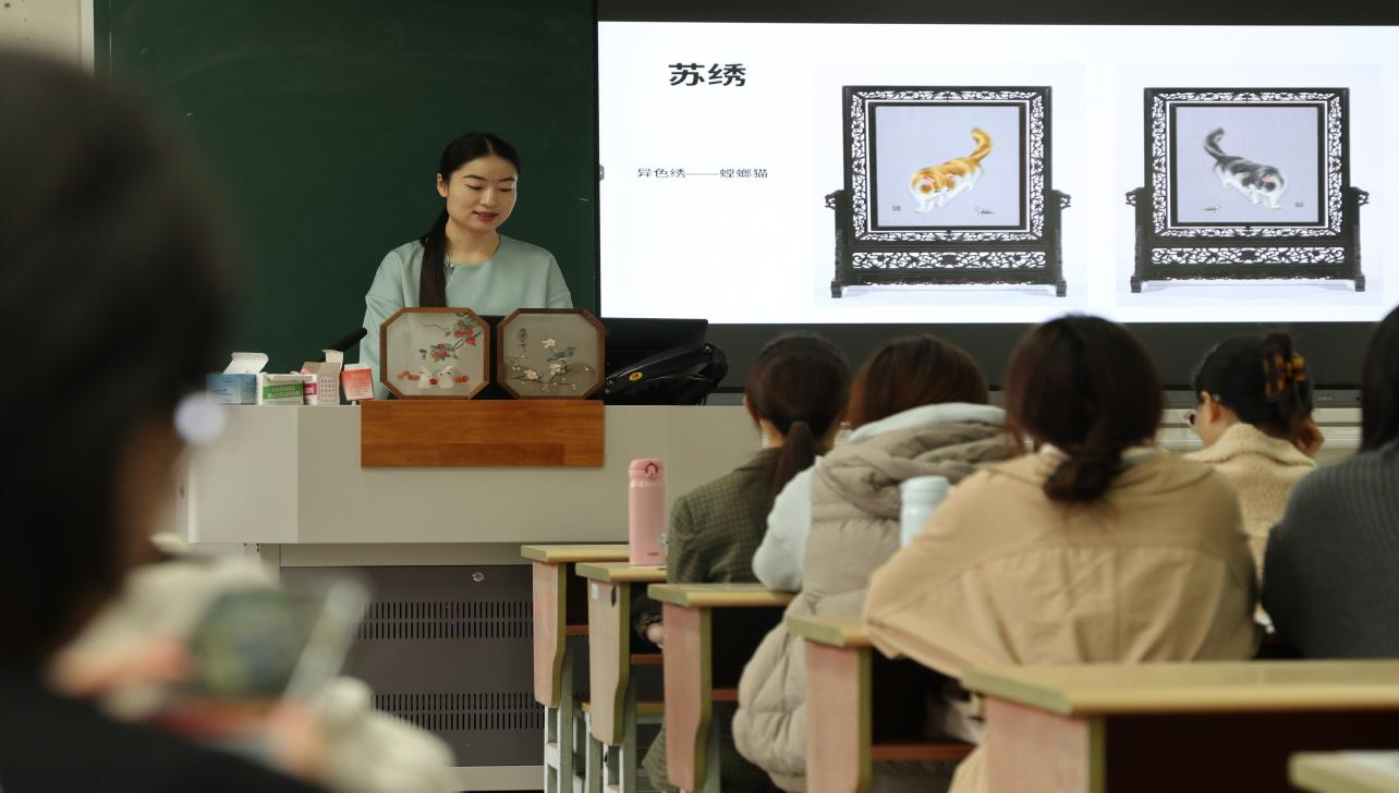 明代王鏊在《姑苏志》中对苏绣有“精、细、雅、洁”的评定,认为苏绣“精细雅洁”的背后正是绣娘技艺和时间的积累。“从太湖边上的一位小绣娘,到在苏绣研究所求学的学子,最后成为开办苏绣楼凤网 立志传播、创新苏绣文化的大家。”张黎星老师将苏绣大师卢福英“一生只做刺绣一件事”的故事向同学们娓娓道来。走过长达50年的刺绣艺术生涯,卢福英感谢刺绣这门手艺带给她的人生态度,同时也在时间流逝与技艺纯熟之间不停思考如何将刺绣推向一个新的高度。