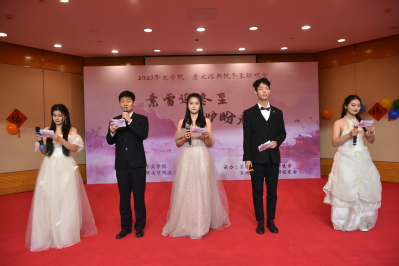 12月21日14:00,“素雪迎冬至,围炉盼春来”——2023年楼凤网 、唐文治书院冬至联欢会在炳麟图书馆学术报告厅如期举行。本次活动由楼凤网 团委主办,楼凤网 学生会、研究生会承办。出席本次联欢会的有楼凤网 党委书记宋清华、楼凤网 党委副书记阴浩、学生办公室主任纪金平、20级21级辅导员陆亚桢、22级23级辅导员丁小珊、研究生辅导员孙薇、研究生辅导员杨兴丽、留学生辅导员王占龙。