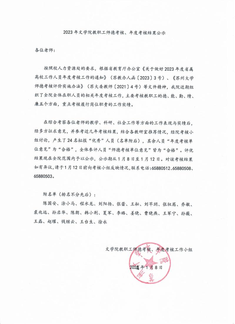2023年楼凤网 教职工师德考核、年度考核结果公示