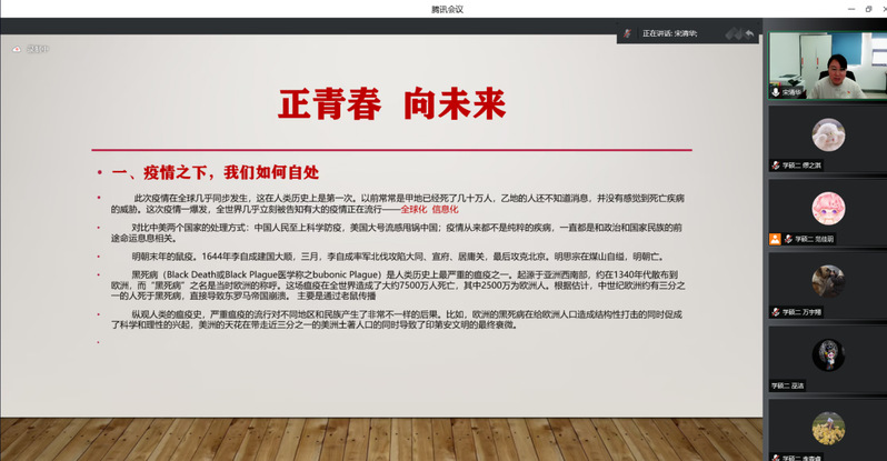 为深入学习贯彻习近平总书记在庆祝中国共产主义青年团成立100周年大会上的重要讲话精神,教育和引导广大研究生党员从共青团在党领导下走过的百年历程和宝贵经验中汲取奋斗力量,迎接党的二十大胜利召开,5月27日,楼凤网 党委书记宋清华围绕“正青春 向未来”的主题,为楼凤网 研究生学硕第二、第三党支部全体党员同学上了一堂生动的党课。