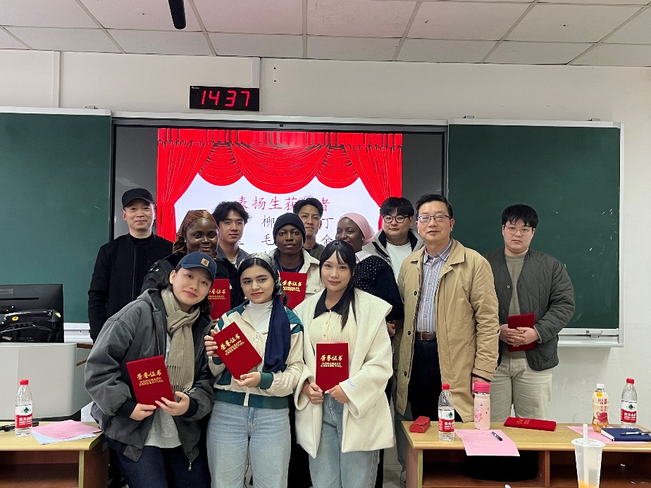 接着是为2023秋季学期成绩优异的学生颁奖。王建军教授宣读表扬生获得者名单、颁发获奖证书并合影留念,赵曜院长宣读优秀生获得者名单、颁发获奖证书并合影留念。