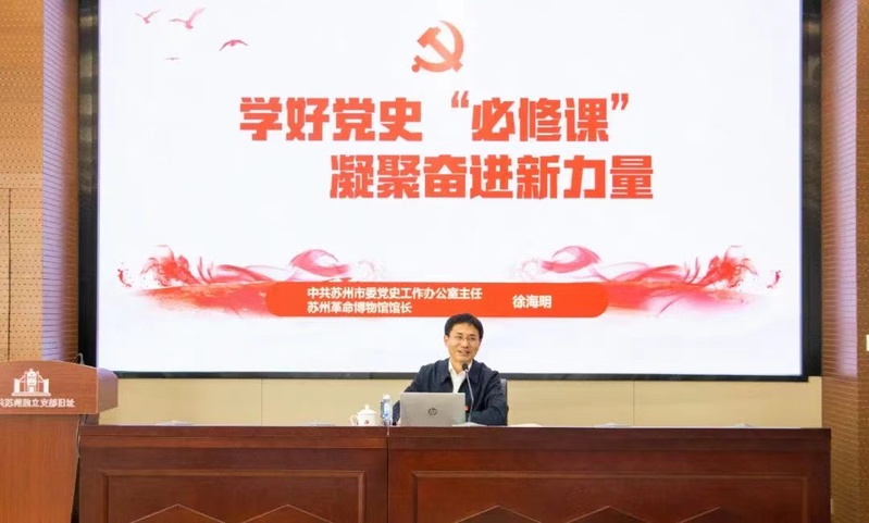随后,徐海明主任作《学好党史“必修课”,凝聚奋进新力量》专题党课。徐主任首先指出,习近平总书记强调“党史是必修课,不是选修课,学好党史是每名党员的必备素养”。接着,徐主任从新民主主义革命的历史任务和时代背景、马克思主义在苏州的传播和中共苏州独立支部的建立、党组织在革命斗争中不断发展、在抗日战争的烽火硝烟中、迎接解放的斗争等五个方面,全面讲授了新民主主义革命时期苏州党史。