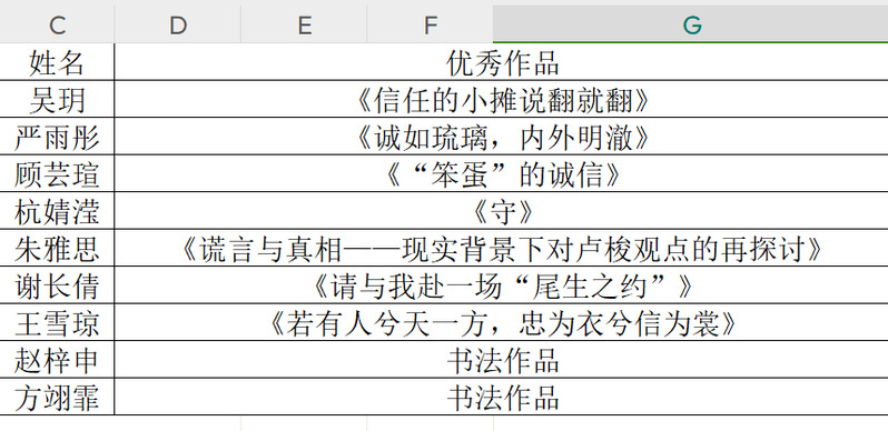在活动过程中,陆续有同学将作品上传到了活动群中,同步进行的还有线下相关书法作品的收集。参与者们各显神通,杭婧滢同学从一位剪纸艺人的真实故事出发,阐述了剪纸艺术传承者的诚信与坚守带给她的深刻印象。谢长倩同学则以孔子的“尾生与女子期于梁下,女子不来,水至不去,抱梁柱而死。”为引,呼吁大家学习尾生的诚信品质,共赴“尾生之约”。不同角度迸发不同的故事与感想,参与者们通过各具特色的作品表达了自己对诚信的理解与感悟。