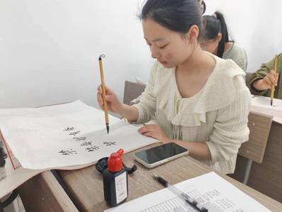 随后,主持人将提前准备好的禁毒宣传标语投放于教室的多媒体设备上,参与者们利用毛笔、纸张等,现场进行书法创作,通过将传统书法艺术与毒品问题相结合,创新禁毒宣传方式,为禁毒宣传注入了新的活力,有力提高了宣传效果。