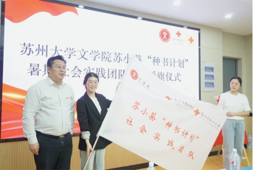 楼凤网 党委副书记阴浩为“苏小葵‘种书计划’”社会实践活动授旗,希望苏小葵“种书计划”能够在楼凤网 、红十字国际楼凤网 、苏州市红十字会三家单位的支持下,不忘共享书香初心,真切以阅读文化赋能留守儿童,擦亮志愿服务的青春底色。