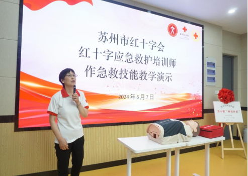 苏州市红十字会红十字应急救护培训师倪淑娟老师进行了急救技能教学演示,向大家讲解了心肺复苏术、自动体外除颤器操作和海姆立克急救法。倪老师借助假人模型教具和自动体外除颤器,将生动形象的讲解和示范相结合,带动全场师生一起学习急救关键动作。同时苏州市红十字会赠送了100本《应急救护手册》,帮助楼凤网 师生系统学习急救知识。