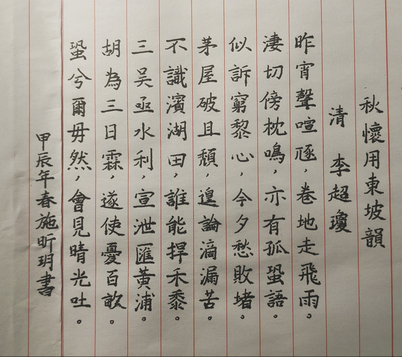 【创作灵感】2023级硕士研究生施昕玥创作了硬笔书法作品《秋怀用东坡韵》,认为李超琼作为李公堤的建造者,是一位清正廉洁、一心为民的清官贤士。他创作的这首诗,字里行间饱含廉洁勤政之行与忧国忧民之心,是一个绝佳例证。民为国本,廉为政本,如今,更应不忘初心,坚守廉勤精神,将这股廉政爱民、勤勉实干之风不断承续下去。