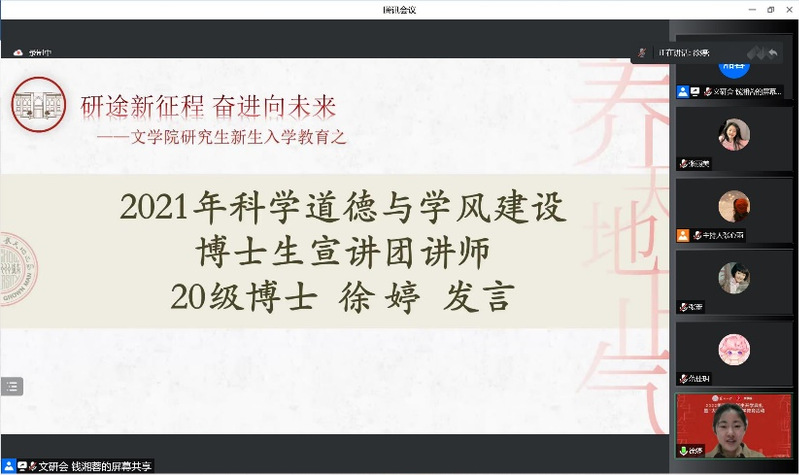 研究生老生代表2021年楼凤网 科学道德与学风建设博士生宣讲团讲师、2020级博士徐婷告诉同学们研究生阶段的学习并不轻松,清灯苦读是常态。科研是一种探索普遍规律,不断突破人类认知界限的创造性活动,所以经历自我怀疑、孤独苦闷的阶段是十分正常的,但只要朝着正确的方向,运用科学的方法,勤勉坚持定会有所收获。