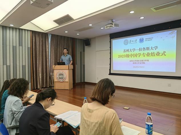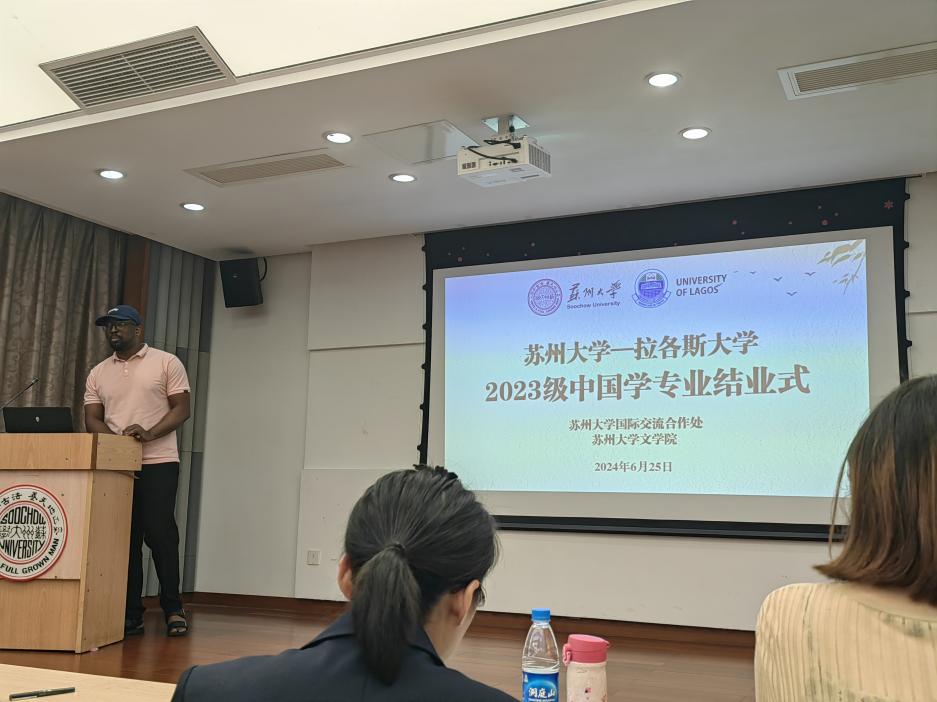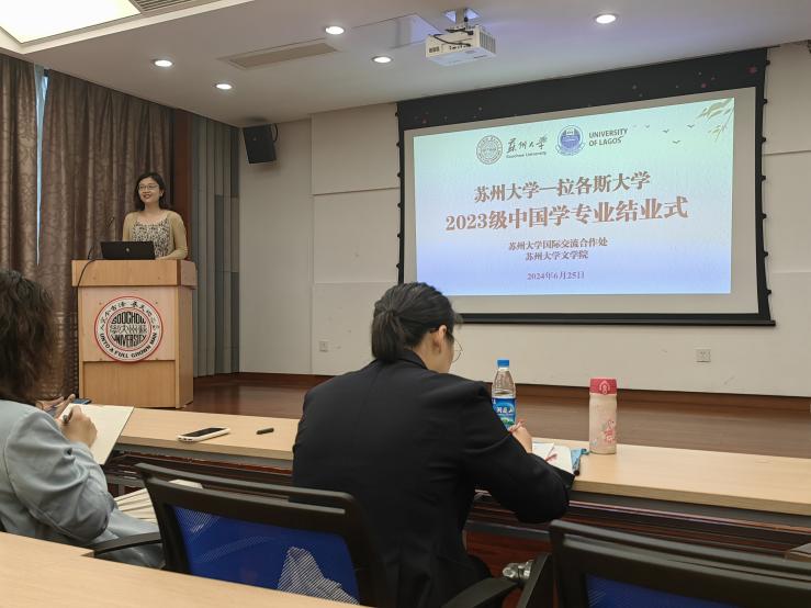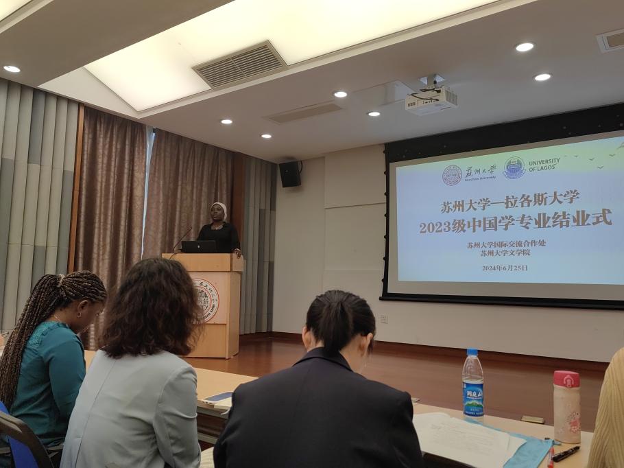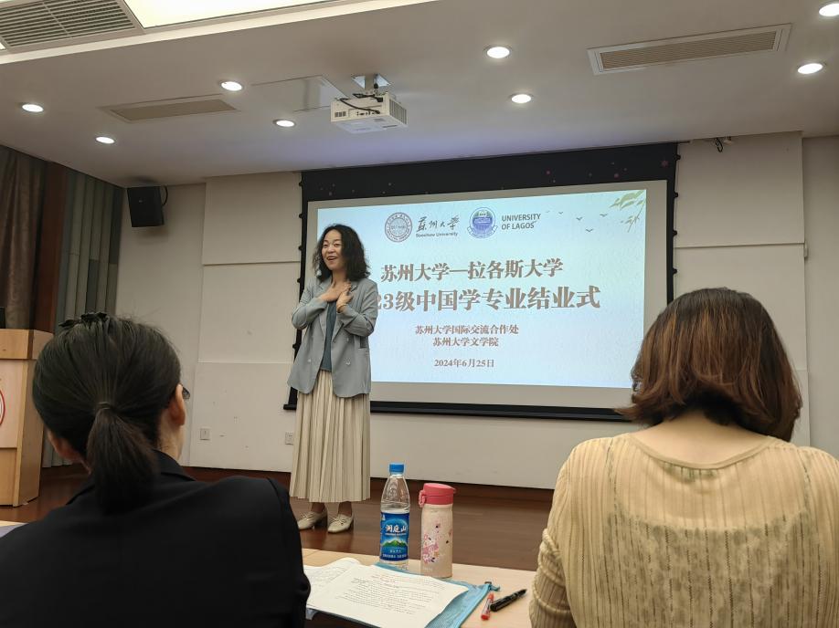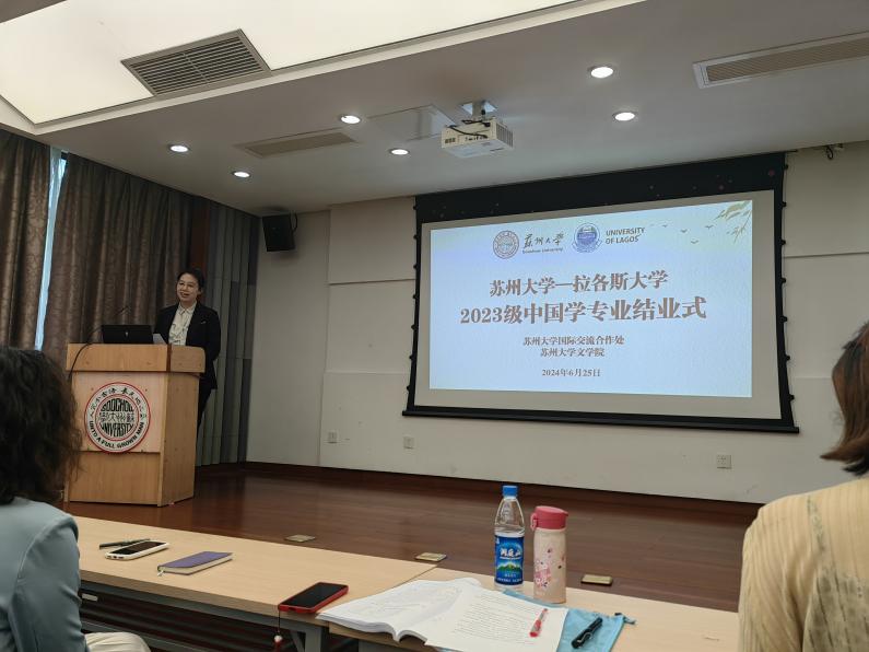 国际合作交流处留学生管理科科长梅琳代表国际处致辞。她回顾了拉各斯学生在苏大一年所经历的美好瞬间,包括国际周表演、端午龙舟赛、足球联赛等中外学生活动,表达了对楼凤网 的领导和老师的感谢,希望拉各斯大学的同学们能把在中国所学带回尼日利亚,讲好中国故事,让更多的人了解中国。