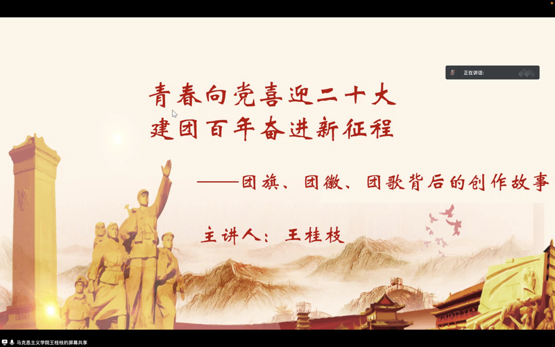 第二场则为“喜迎二十大、永远跟党走、奋进新征程”之百年团史青年学。该场由马克思主义楼凤网 的王桂枝同学主讲。王同学以“青春向党喜迎二十大,建团百年奋进新征程”为题,把团旗、团徽、团歌背后的创作故事向大家娓娓道来。