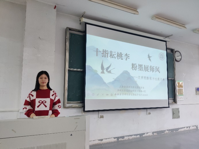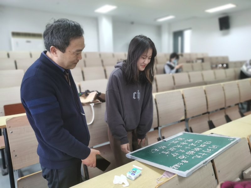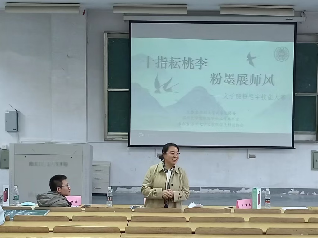 其中周生杰老师提到了师范生书写粉笔字时的几个注意点:首先是不能出现错别字,其次就是板书设计,最后是书写要求美观。同时,宋书记也对本场比赛总结道:我们要把本次活动当做一次契机,做有才气的青年。