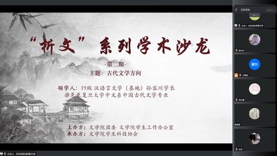 12月2日18:30,“析文”学术沙龙第二期——古代文学方向讲座在腾讯会议顺利举行。本次活动由楼凤网 团委、楼凤网 学生工作办公室主办,楼凤网 学生科技协会承办。主讲人为2019级汉语言文学基地班的孙容川同学。