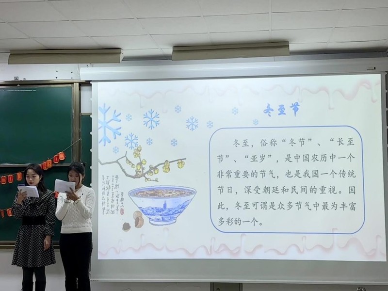 “天时人事日相催,冬至阳生春又来。”为了让各位同学对冬至有更加深刻的理解,主持人围绕民俗传统、饮食习惯、文化活动展开,向大家详细介绍了冬至节气所包含的深厚文化底蕴和哲思意趣。